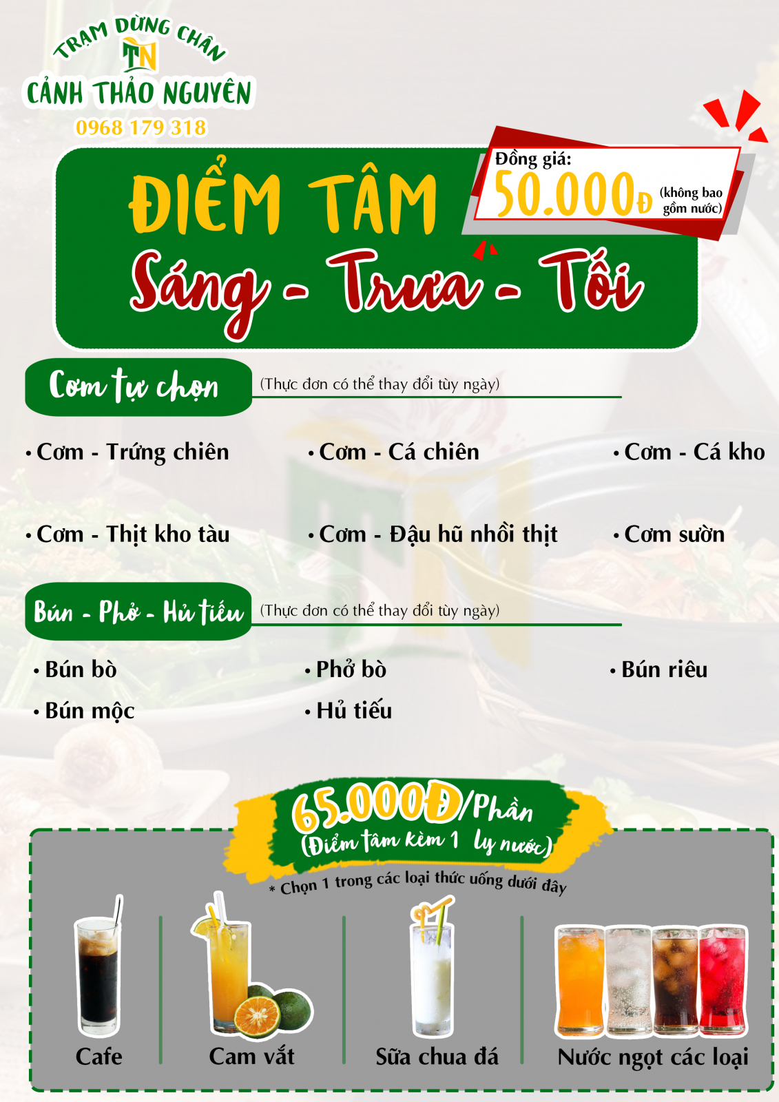 Danh sách món ăn phục vụ Quý khách 24/24 tại trạm dừng chân Cảnh Thảo Nguyên với các món ăn bình dân đồng giá 50.000đ/1 phần ăn (không bao gồm nước uống). Ngoài ra Quý khách có thể lựa chọn Combo bao gồm 01 phần điểm tâm tự chọn và 01 ly nước tự chọn (cafe, cam vắt, sữa chua đá, nước ngọt các loại) với giá ưu đãi chỉ 65.000đ.